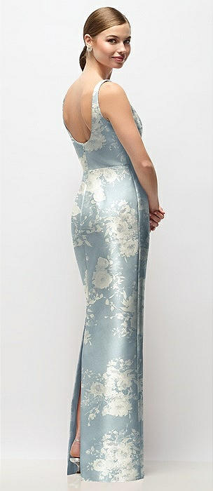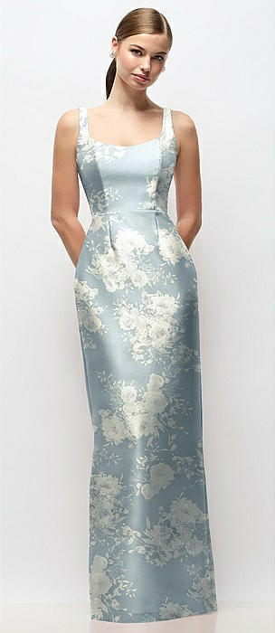Scoop Neck Floral Satin Column Maxi Dress in porcelain blue seraphina floral