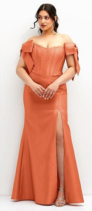 Off-the-Shoulder Bow Satin Corset Dress with Fit and Flare Skirt in portofino orange