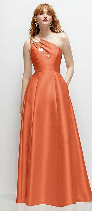 One-Shoulder Full A-Line Satin Gown with Handworked Floral Appliqué in portofino orange