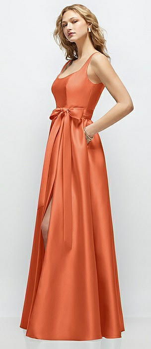 Scoop Neck Corset Satin Maxi Dress with Floor-Length Bow Tails in portofino orange