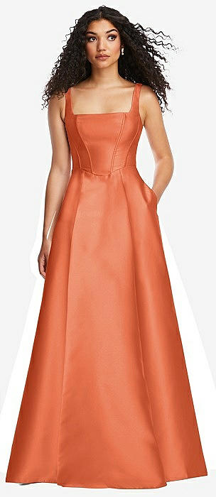 Boned Corset Closed-Back Satin Gown with Full Skirt and Pockets in portofino orange