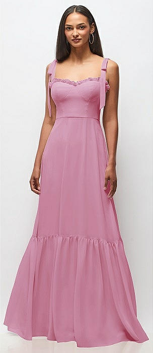 Tie-Shoulder Bustier Bodice Ruffle-Hem Maxi Dress in powder pink