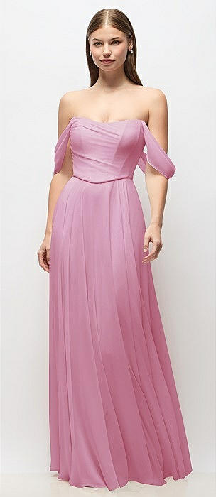 Off-the-Shoulder Basque Corset Chiffon Maxi Dress in powder pink