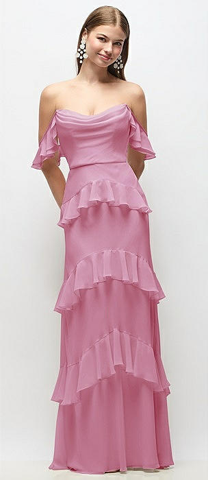 Off-the-Shoulder Cowl Chiffon Tiered Ruffle Maxi Dress with Convertible Ruffle Straps in powder pink