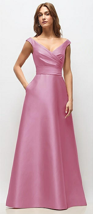 Off-the-Shoulder Draped Wrap Satin Maxi Dress in powder pink
