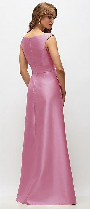 Basque-Neck Satin Column Maxi Dress with Off-the-Shoulder Bows in powder pink