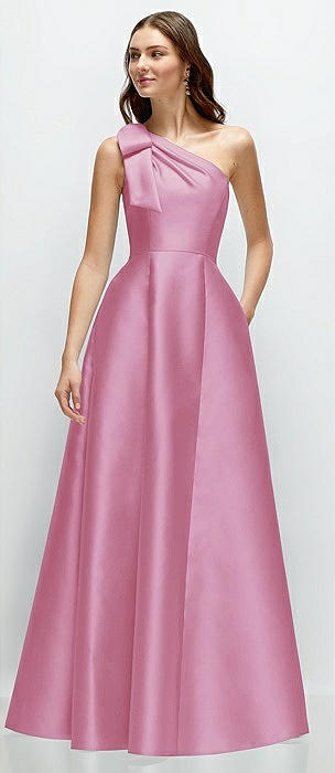 Bow One-Shoulder Full A-Line Satin Maxi Dress in powder pink