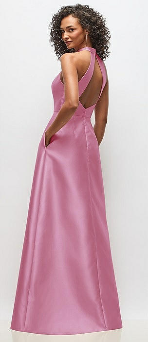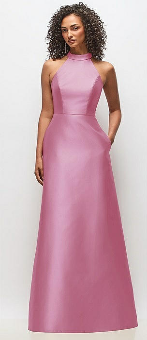 High-Neck Halter Open-Back Satin Trumpet Dress in powder pink