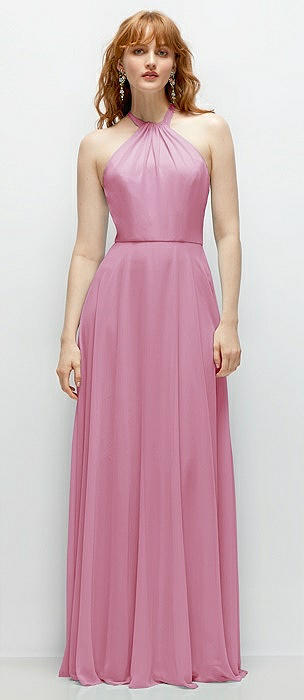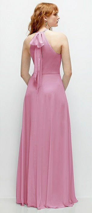 Shirred Halter Chiffon Maxi Dress with Back Sash-Tie Closure in powder pink