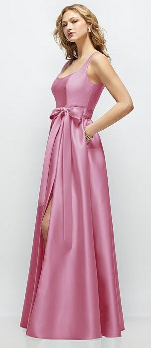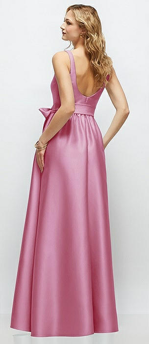 Scoop Neck Corset Satin Maxi Dress with Floor-Length Bow Tails in powder pink