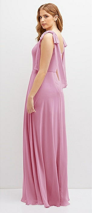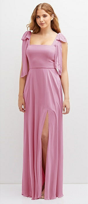 Bow Shoulder Square Neck Chiffon Maxi Dress in powder pink