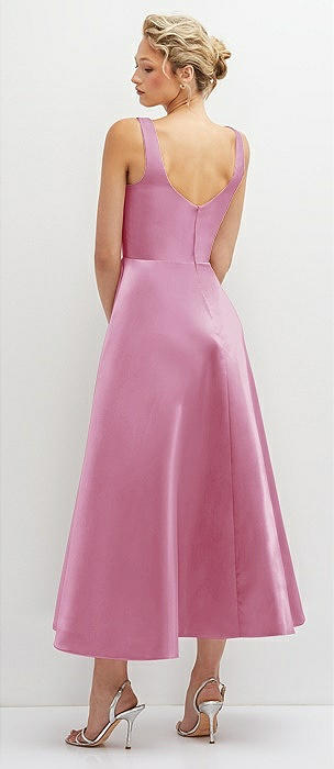 Square Neck Satin Midi Dress with Full Skirt & Pockets in powder pink
