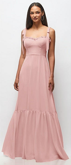 Tie-Shoulder Bustier Bodice Ruffle-Hem Maxi Dress in rose