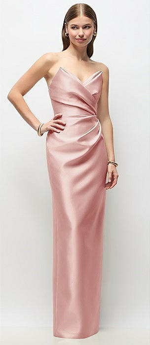 Strapless Asymmetrical Draped Satin Column Maxi Dress in rose