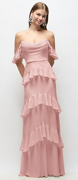 Off-the-Shoulder Cowl Chiffon Tiered Ruffle Maxi Dress with Convertible Ruffle Straps in rose