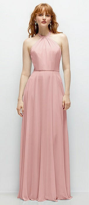 Shirred Halter Chiffon Maxi Dress with Back Sash-Tie Closure in rose