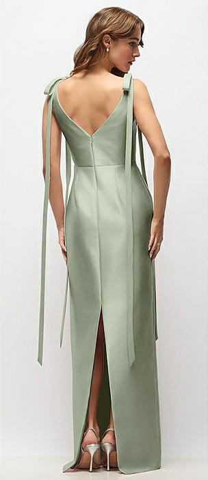 Bateau Neck Satin Column Maxi Dress with Exaggerated Tail Bow Straps in sage