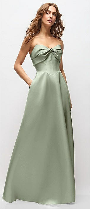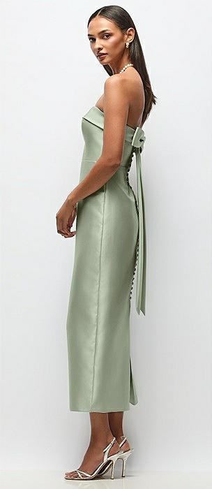 Strapless Cuff Satin Midi Dress with Column Skirt & Back Bow in sage