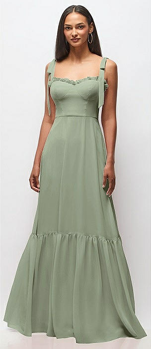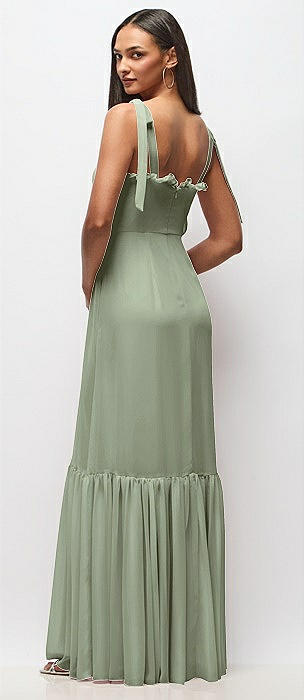 Tie-Shoulder Bustier Bodice Ruffle-Hem Maxi Dress in sage