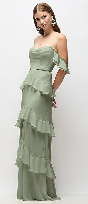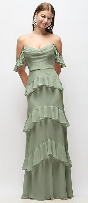 Off-the-Shoulder Cowl Chiffon Tiered Ruffle Maxi Dress with Convertible Ruffle Straps in sage