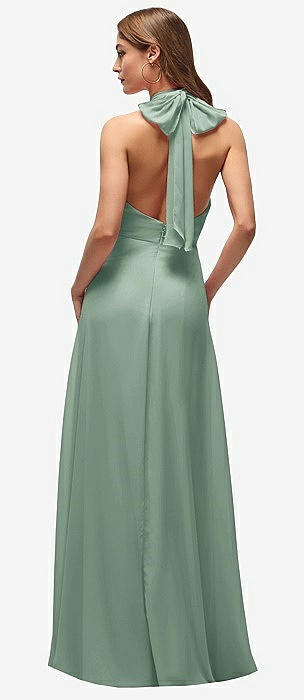 Pleated Halter Bias Satin Maxi Dress with Self-Tie Bow Back in seagrass