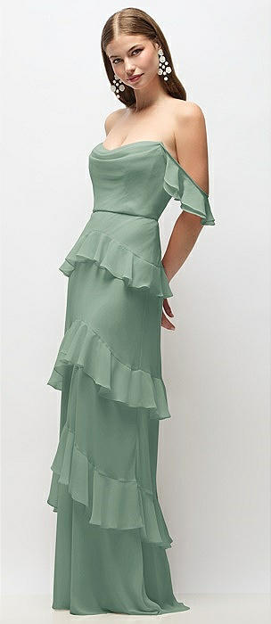 Off-the-Shoulder Cowl Chiffon Tiered Ruffle Maxi Dress with Convertible Ruffle Straps in seagrass