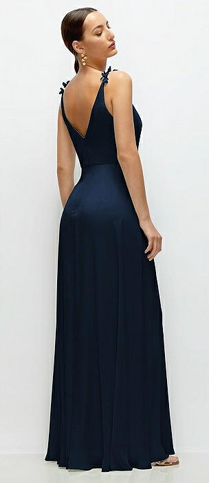 Bow-Shoulder V-Back Chiffon Gown with Front Slit in midnight navy