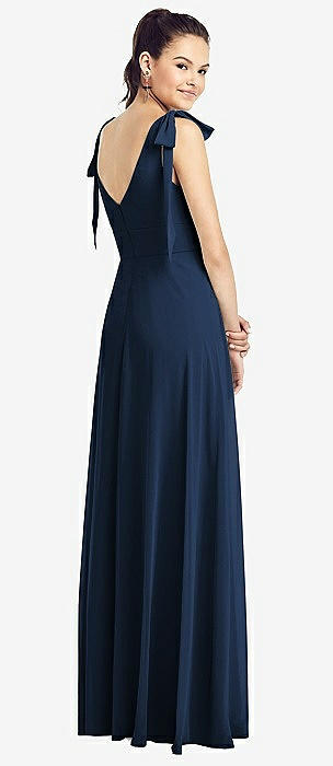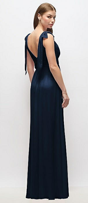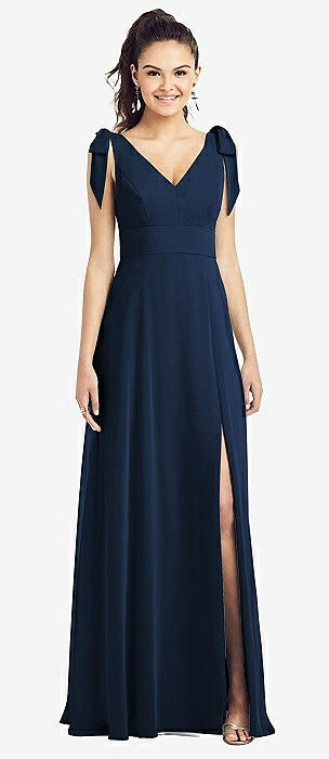 Bow-Shoulder V-Back Chiffon Gown with Front Slit in midnight navy