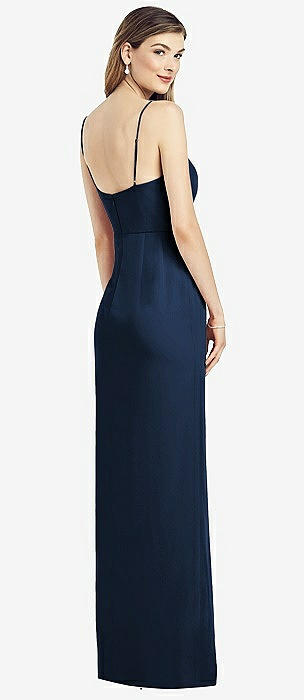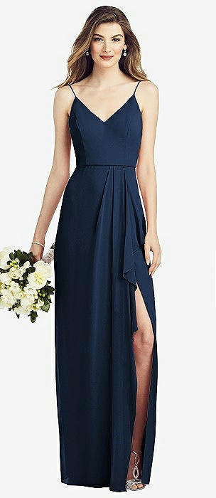 Spaghetti Strap Draped Skirt Gown with Front Slit in midnight navy