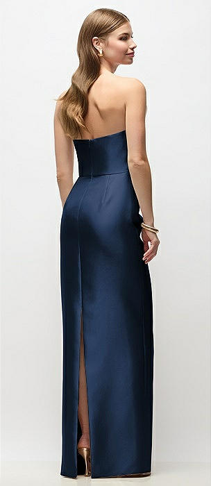 Strapless Draped Bodice Stretch Satin Column Maxi Dress in midnight navy