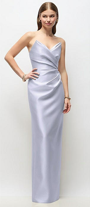 Strapless Asymmetrical Draped Satin Column Maxi Dress in silver dove