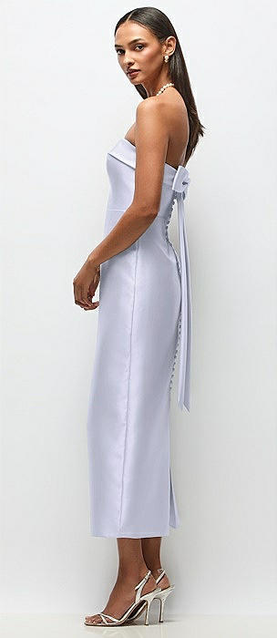 Strapless Cuff Satin Midi Dress with Column Skirt & Back Bow in silver dove