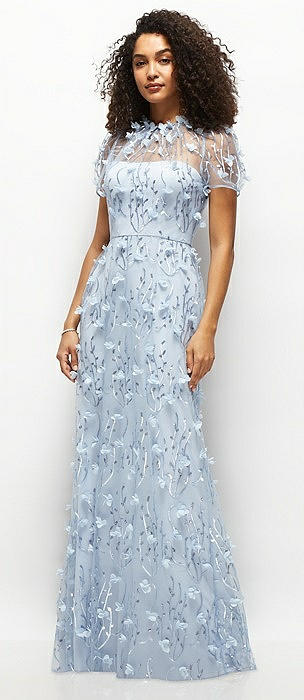 3D Floral Embroidered Puff Sleeve A-line Maxi Dress with Petal-Adorned Illusion Neckline in silver dove