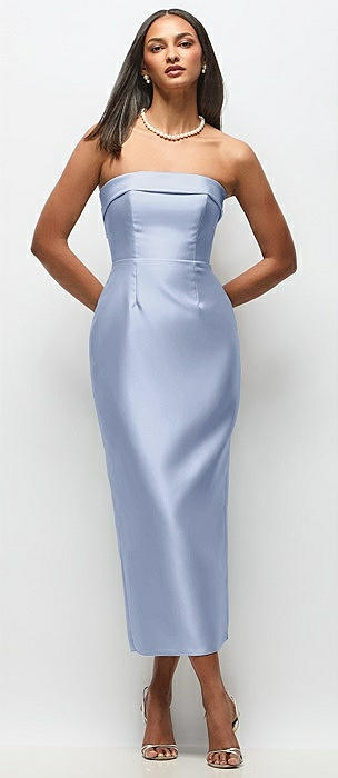 Strapless Cuff Satin Midi Dress with Column Skirt & Back Bow in sky blue
