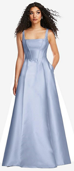 Boned Corset Closed-Back Satin Gown with Full Skirt and Pockets in sky blue