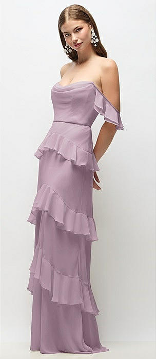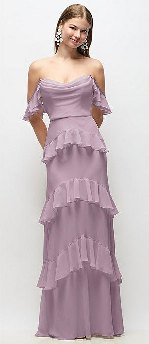 Off-the-Shoulder Cowl Chiffon Tiered Ruffle Maxi Dress with Convertible Ruffle Straps in suede rose
