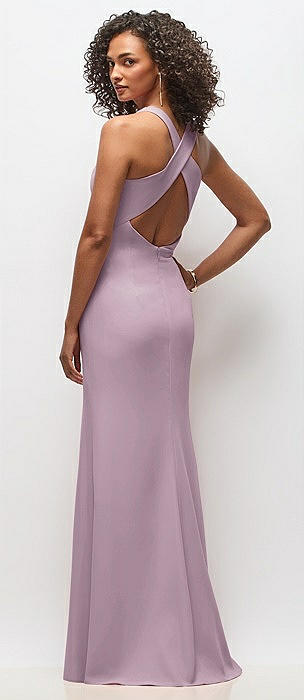 Cowl-Neck Wide Strap Crepe Trumpet Gown with Front Slit in suede rose
