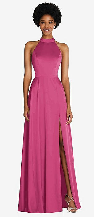 Stand Collar Cutout Tie Back Maxi Dress with Front Slit in tea rose