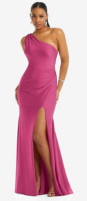 One-Shoulder Bias-Cuff Stretch Satin Mermaid Dress with Slight Train in tea rose