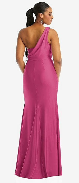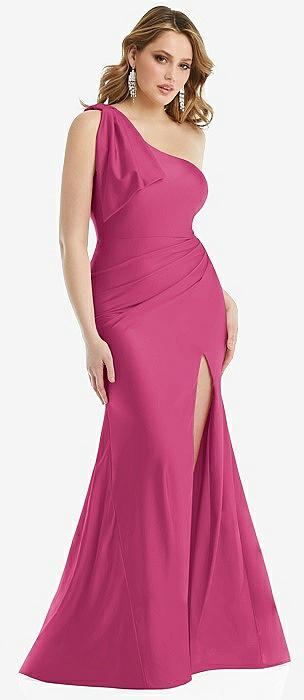 Cascading Bow One-Shoulder Stretch Satin Mermaid Dress with Slight Train in tea rose