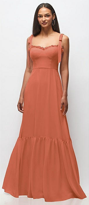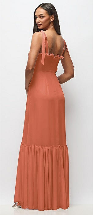 Tie-Shoulder Bustier Bodice Ruffle-Hem Maxi Dress in terracotta copper