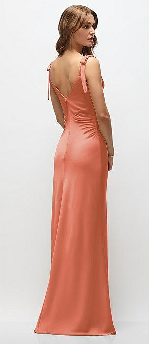 Soft Cowl Neck Ruched Side Satin Bias Maxi Dress with Shoulder Bows in terracotta copper