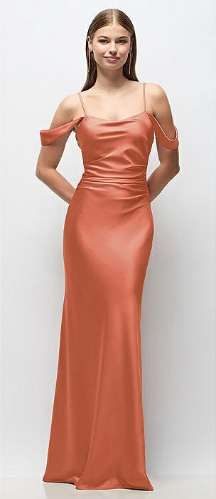 Off-the-Shoulder Swag Ruched Side Satin Bias Maxi Dress with Adjustable Spaghetti Straps in terracotta copper