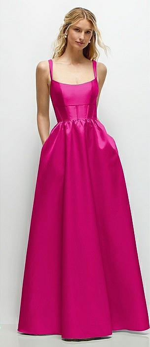 Scoop Neck Drop Basque Skirt Satin Maxi Dress with Pockets in think pink