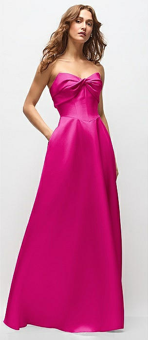 Strapless Pleated Draped Satin Mini Dress with Dramatic Long Tail Bow & Covered Buttons in think pink