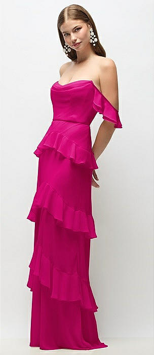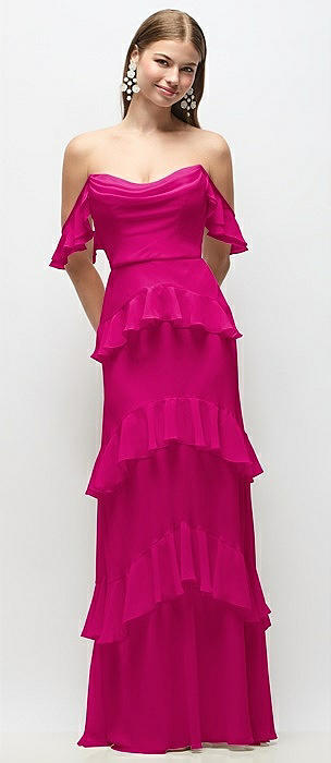 Off-the-Shoulder Cowl Chiffon Tiered Ruffle Maxi Dress with Convertible Ruffle Straps in think pink