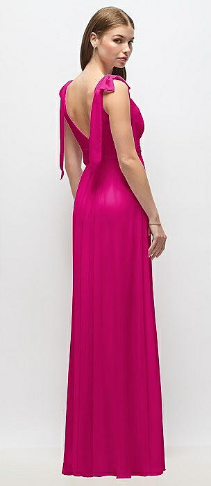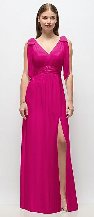 Plunge Neckline Bow Shoulder Empire Waist Chiffon Maxi Dress in think pink