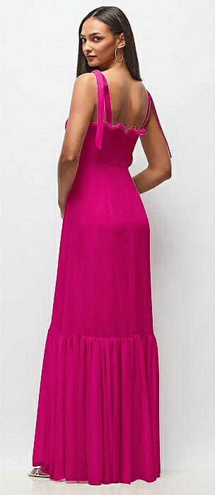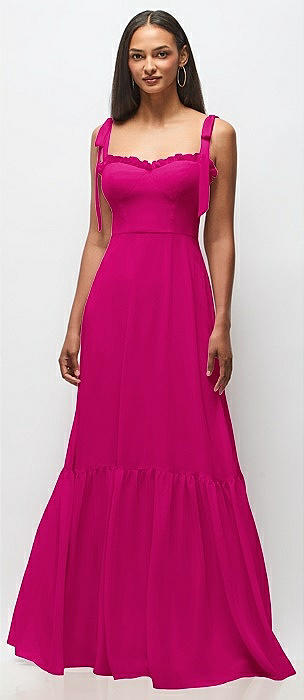 Tie-Shoulder Bustier Bodice Ruffle-Hem Maxi Dress in think pink