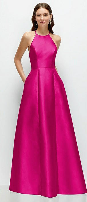 Jewel Neck Halter Full A-Line Satin Maxi Dress in think pink