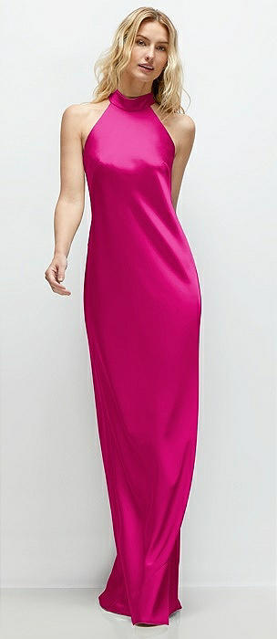High Halter Tie-Strap Open-Back Satin Maxi Dress in think pink